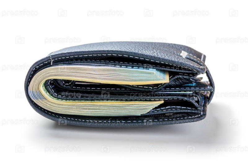 Плотный кошелек со 100 долларовыми купюрами на белом фоне