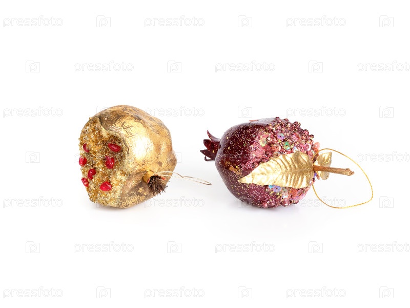 Золотые и красные гранаты украшают рождественскую елку, изолированную на белом фоне