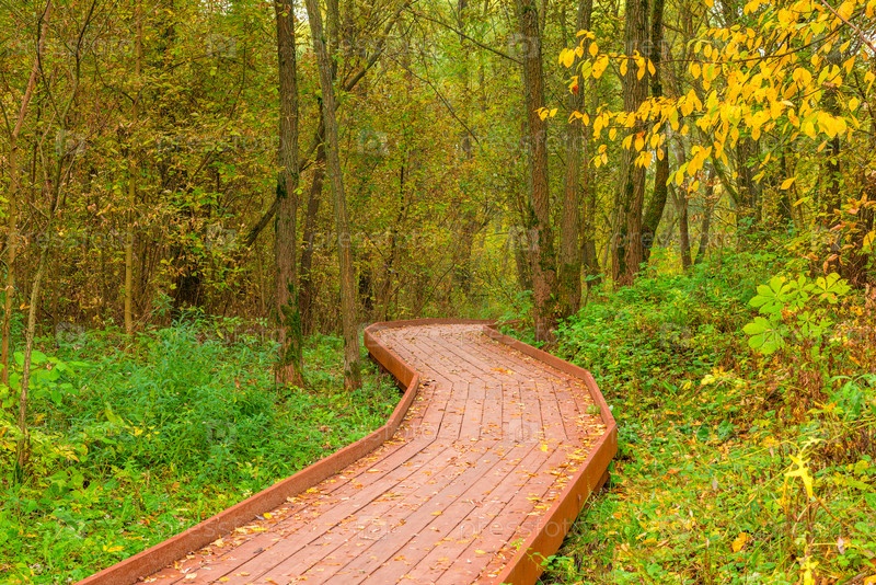 Осенний пейзаж, деревянный пол в парке, покрытый опавшими листьями