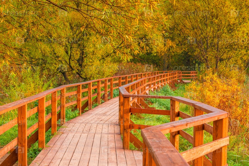 Деревянный мост и тропа в осеннем пустом парке