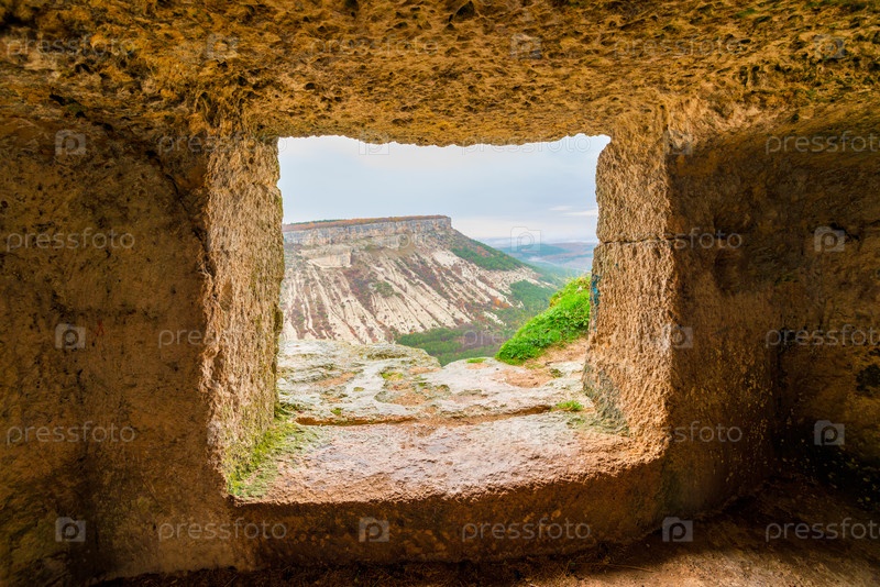 Вид на гору в окне пещерного города Чуфут-Кале, Крым, Россия