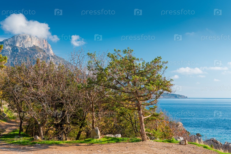 Деревья у моря на фоне высокой горы в заливе