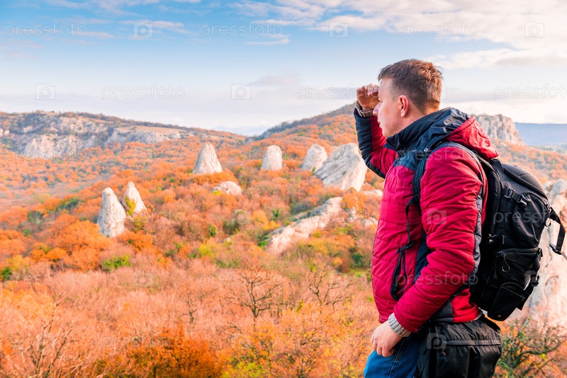 Пешие прогулки в горах, путешественник, любующийся осенними горами