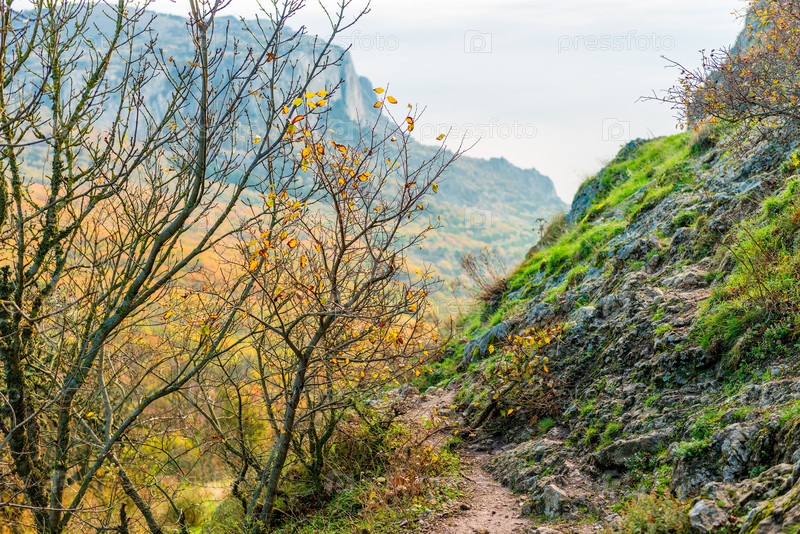 Осенний пейзаж в горах, на переднем плане дерево с опавшими листьями