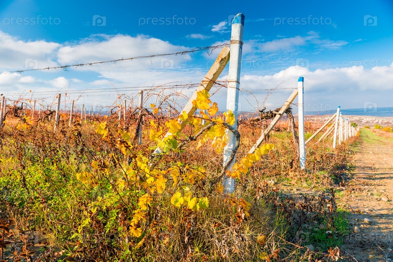 Виноградные лозы поздней осенью после сбора урожая солнечного ландшафта