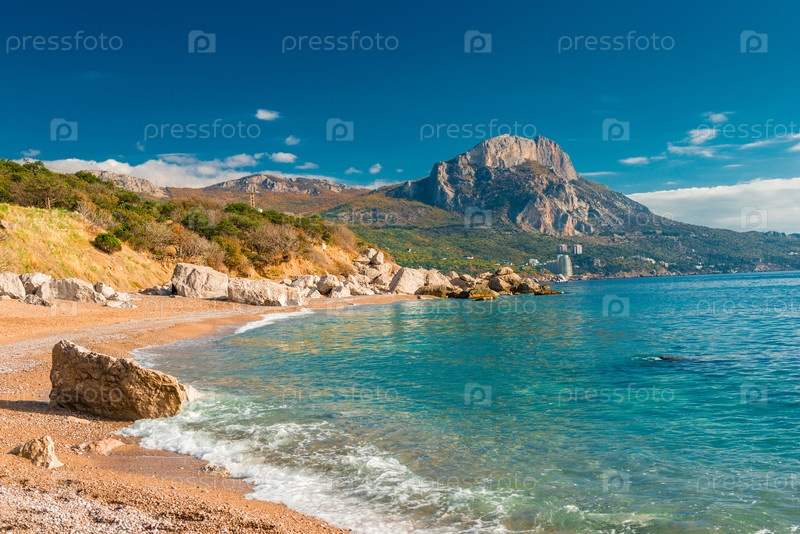 Залив моря с прозрачной лазурной водой и высокими горами, солнечный пейзаж, Крым, Россия