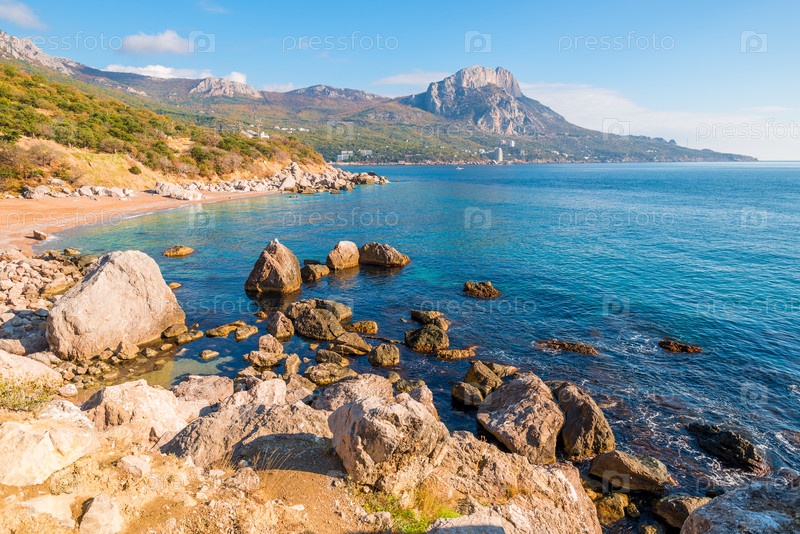 Живописный пустой пляж залива, окруженный горами