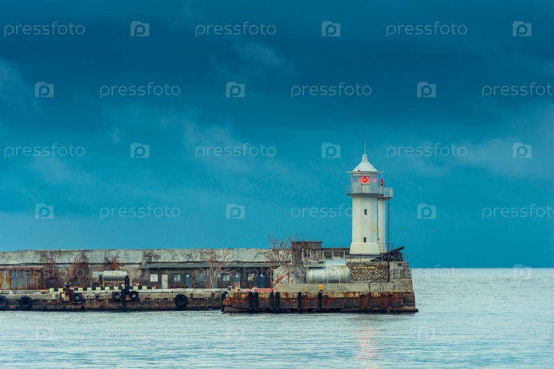 Горизонтальная фотография маяка с красным фонарем на фоне моря и дождливо-голубых облаков