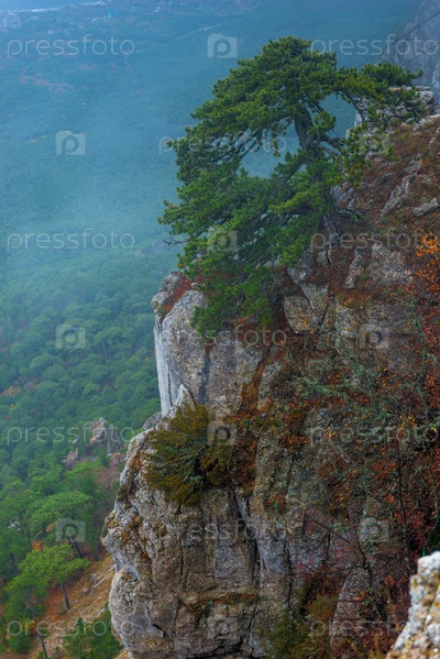 Высокие крутые скалы, ели на горном вертикальном ландшафте