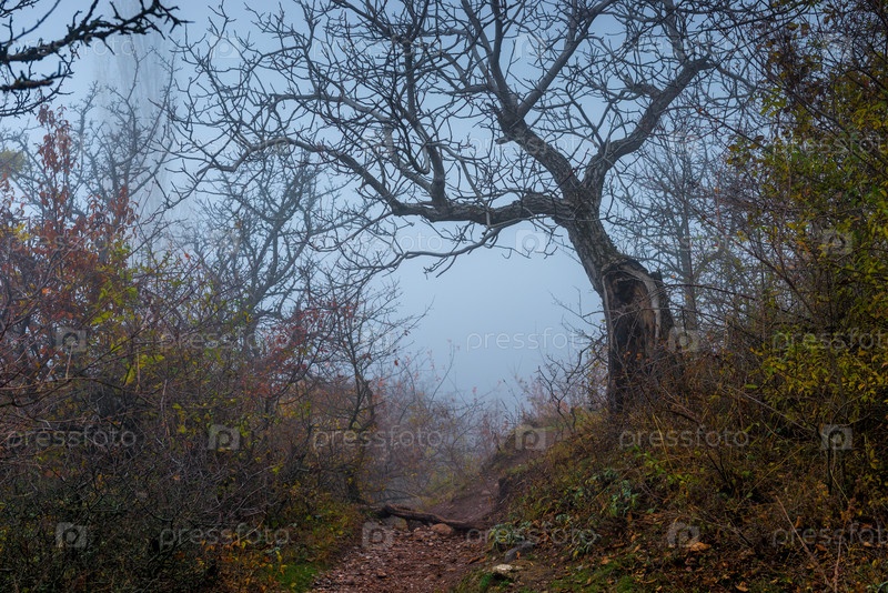 В кадре заноза с опавшими листьями туманный осенний день, пейзаж в горах