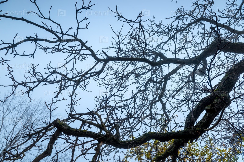 Ветви дерева без листьев поздней осенью против неба в пасмурный день