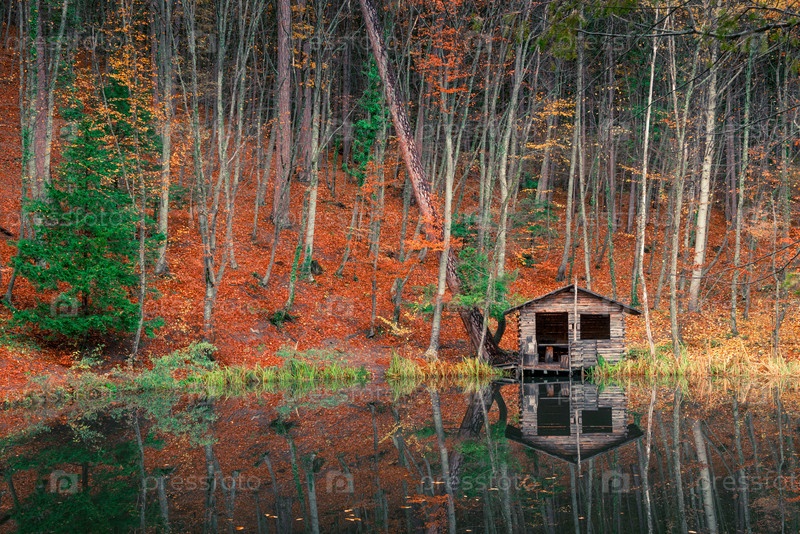 Старый дом рыбака возле лесного пруда осенью