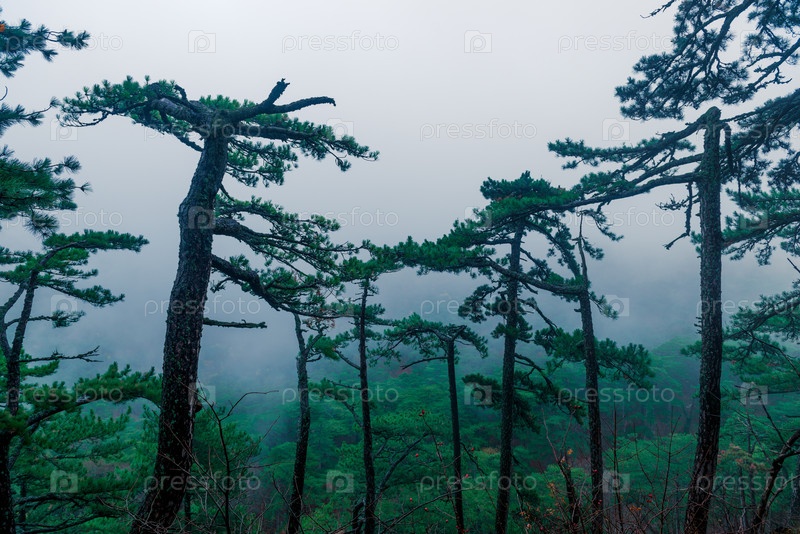Хвойные высокие деревья в горах в осенний туманный пасмурный день