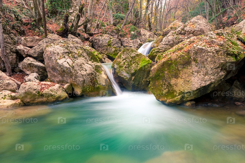 Красивая природа - текущая вода между камнями в горах, валуны, покрытые мхом
