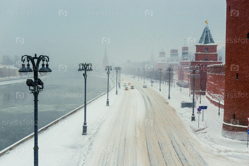 Снежная буря в городе Москве, дорога у стен Кремля, вид на зимний город, Россия