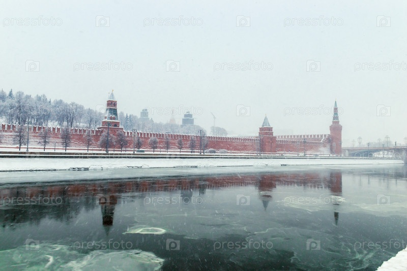 Зима в Москве, замерзшая река и вид на Кремль в метель, Россия