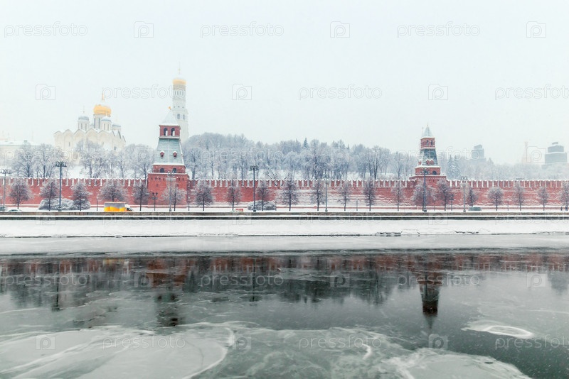 Замерзшая река и вид на Кремль в метель, Россия Москва в зимнем городском пейзаже