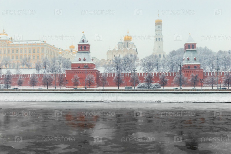 Московский городской пейзаж зимой, замерзшая река и вид на Кремль в метель