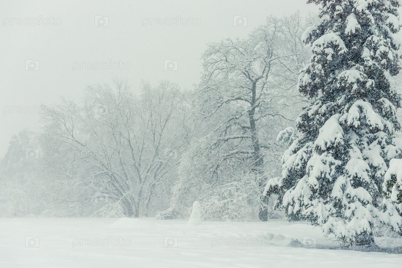 Деревья в снежной буре, зимний лесной ландшафт в январе