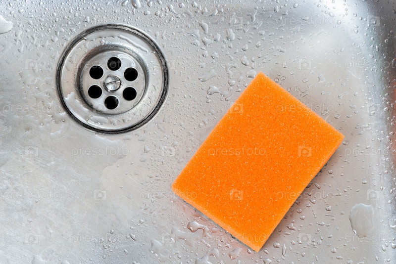Апельсиновая губка и слив нержавеющей кухонной раковины крупным планом
