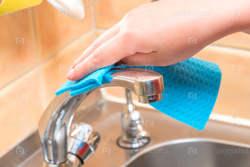 Уборка кухни - женская рука натирает кран тряпкой
