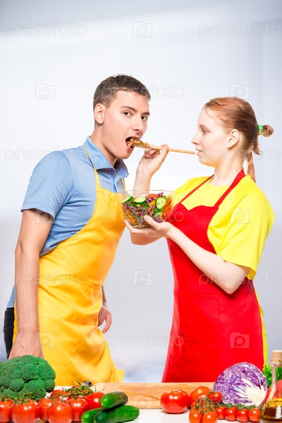 Жена угощает мужчину свежим овощным салатом, парой фартуков на кухне