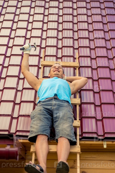 Ремонтник на лестнице на крыше во время отдыха от работы