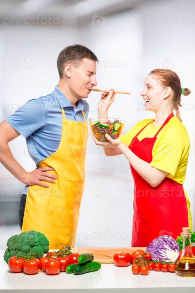 Девушка угощает своего возлюбленного свежим овощным салатом, который они вместе готовили на кухне