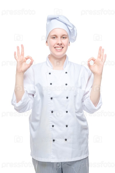 Все в порядке - шеф-повар стреляет на белом фоне, жесты рук