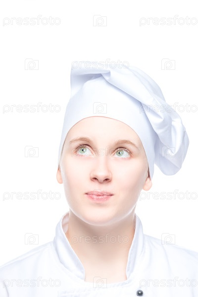 Девушка-повар в кепке смотрит вверх, портрет изолирован на белом фоне