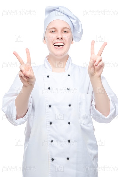Счастливая женщина-повар стреляет на белом фоне, жестикулируя руками