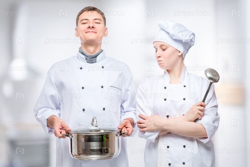 Пара в костюмах повара позирует со сковородкой на фоне кухни ресторана