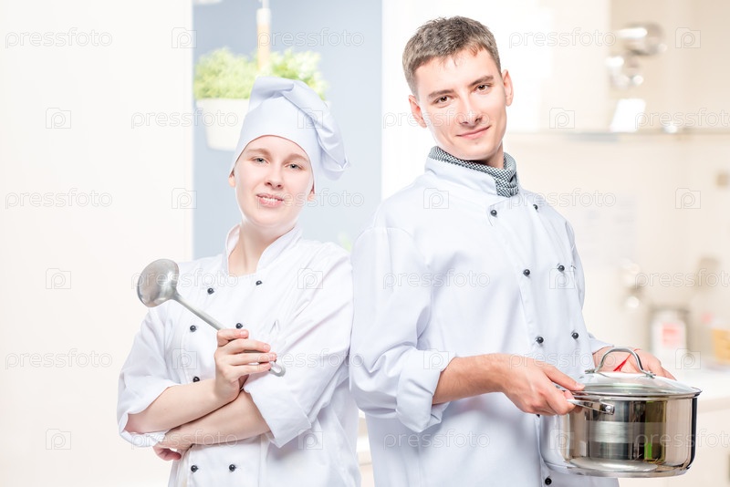 Горизонтальный портрет пары поваров с кастрюлей и ковшом на фоне кухни