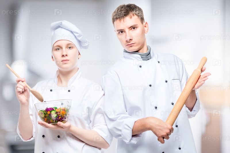 Профессиональная пара готовит с салатом и булавкой на фоне коммерческих кухонь