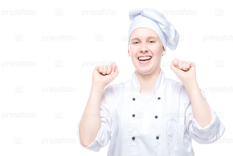 Веселый шеф-повар в костюме радуется победе, эмоциональный портрет на белом фоне