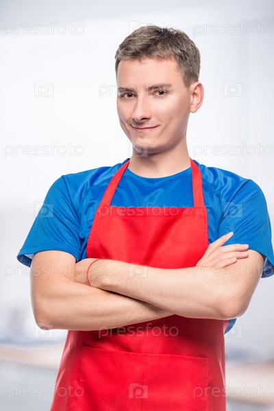 Счастливый портрет мужчины в красном фартуке на сером фоне