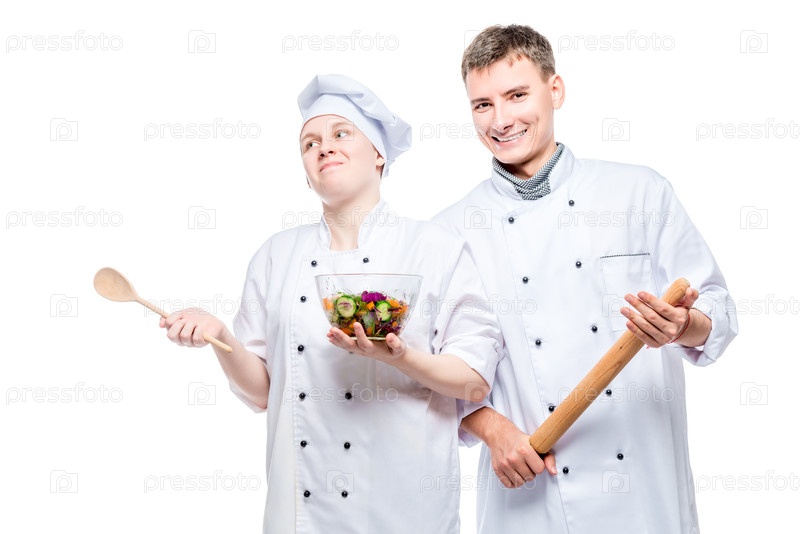 Эмоциональные молодые профессиональные повара с блюдом на белом фоне