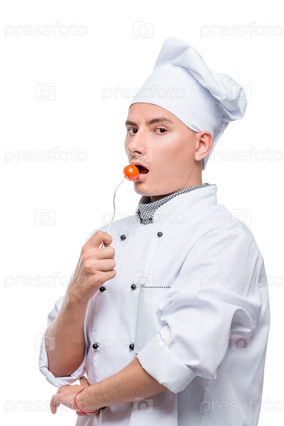 Профессиональный повар с вишневым помидором на вилке, снятый на белом фоне в студии