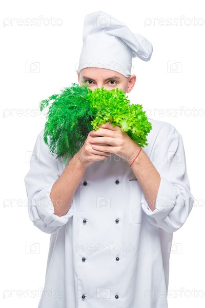 Вертикальный портрет опытного шеф-повара со свежей зеленью на белом фоне