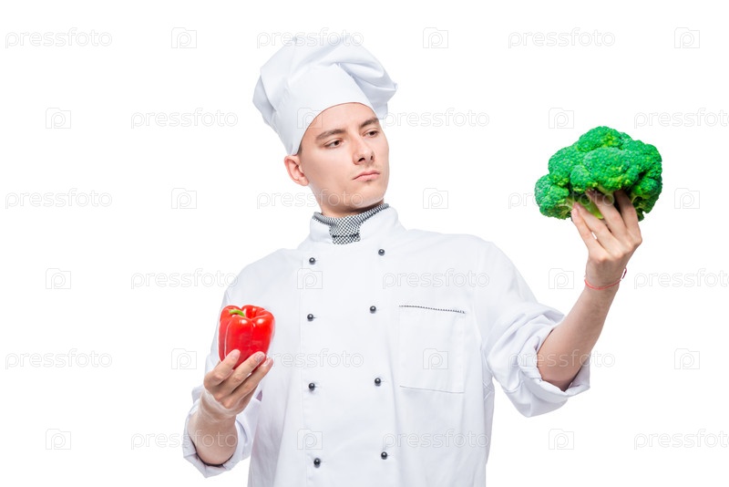 Трудный выбор перца или брокколи - концепт-портрет шеф-повара с овощами на белом фоне