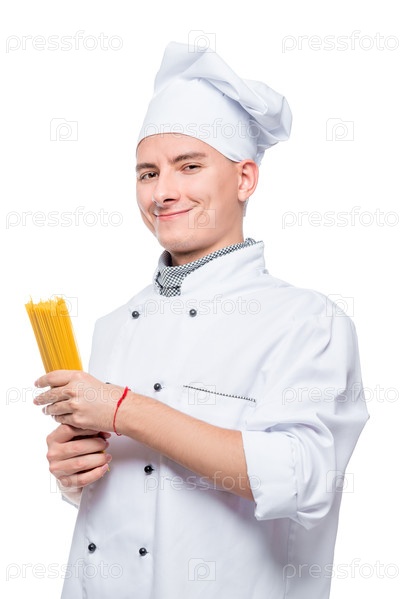 Портрет повара со спагетти, портрет изолированный на белом фоне