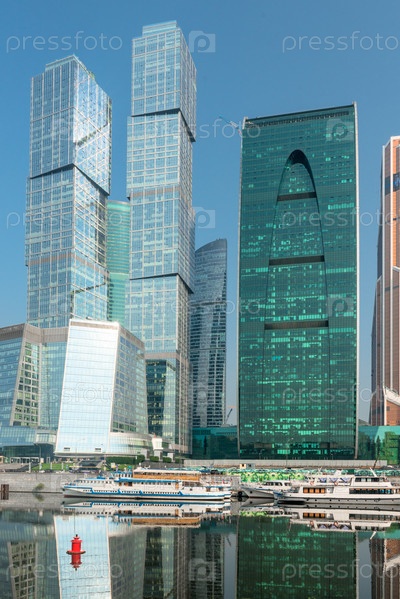 Высокий небоскреб Москва-Сити у реки, отражение зданий в воде