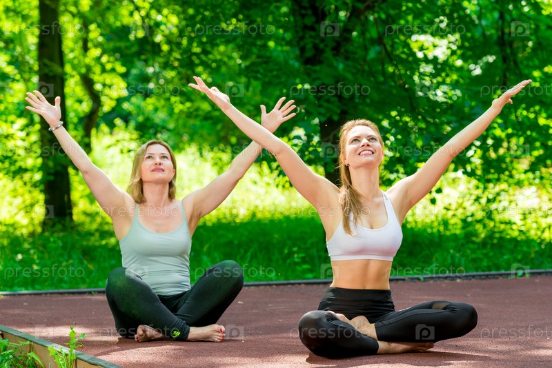Счастливые активные женщины на открытом воздухе в позе лотоса занимаются йогой