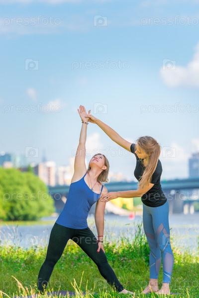 Активные женщины на природе занимаются йогой. Зрелая женщина с индивидуальным тренером