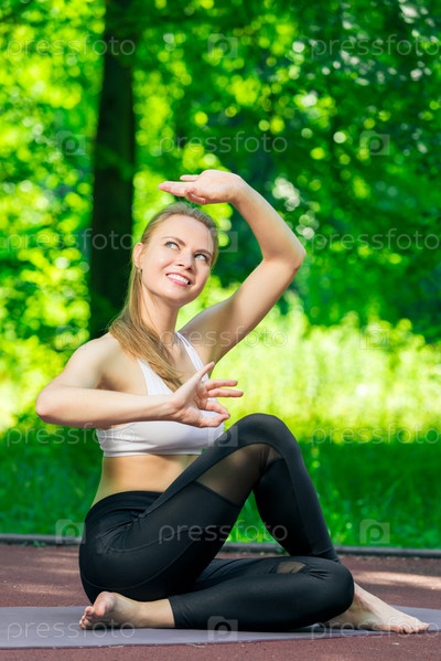 Асаны йоги - пилатес и тренер йоги выполняют упражнения в парке