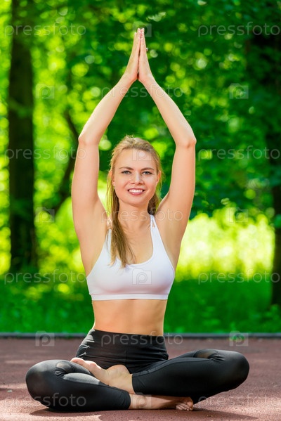 Молодые активные Тренер пилатеса в позиции лотоса на открытом воздухе