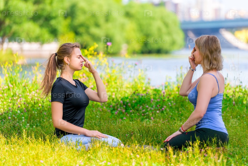 Йога в парке - медитация и дыхательные упражнения с опытным тренером, портрет двух женщин