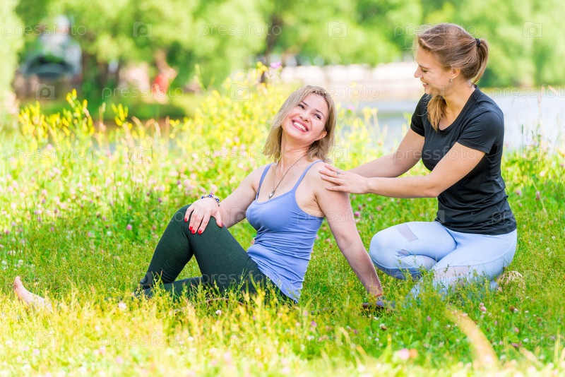 Зрелая женщина с тренером отдыхает в парке после тренировки, шутит и смеется