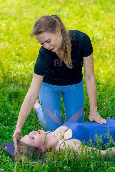 Девушка-тренер контролирует дыхательные упражнения женщины во время йоги, съемки в летнем парке