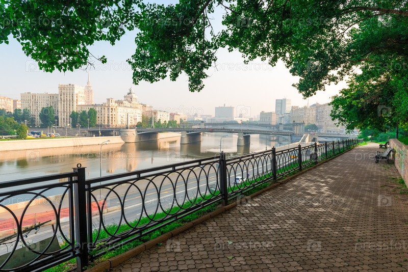 Московский пейзаж на рассвете, прогулка по набережной реки